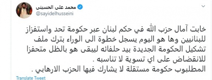 وقال في تغريدة عبر "تويتر" رصدها "المشهد العربي": "خابت آمال حزب الله في حكم لبنان عبر حكومة تحد واستفزاز للبنانيين وها هو اليوم يسجل خطوة إلى الوراء بترك ملف تشكيل الحكومة الجديدة بيد حلفائه ليبقى هو بالظل متحفزا للانقضاض على أي تسوية لا تناسبه".