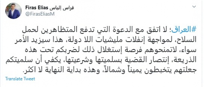 طالب الباحث السياسي العراقي فراس إلياس، اليوم، بعدم الانجرار وراء الدعوات التي تدفع لحمل المتظاهرين للسلاح لمواجهة المليشيات الموالية لإيران بالعراق.