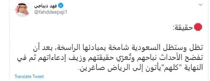 وكتب في تغريدة عبر "تويتر" رصدها "المشهد العربي": "تظل وستظل السعودية شامخة بمبادئها الراسخة، بعد أن تفضح الأحداث نباحهم وتُعرّي حقيقتهم وزيف إدعاءاتهم ثم في النهاية كلهم يأتون إلى الرياض صاغرين".