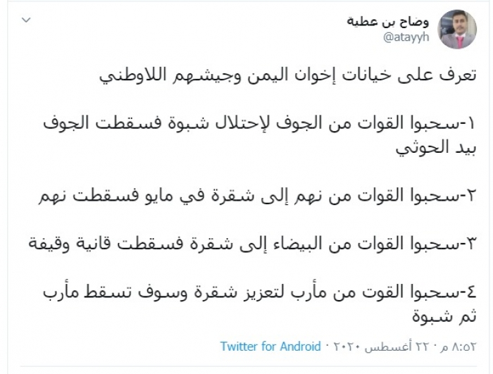 وكتب "بن عطية" تغريدة بتويتر، رصدها "المشهد العربي": "تعرف على خيانات إخوان اليمن وجيشهم اللاوطني: