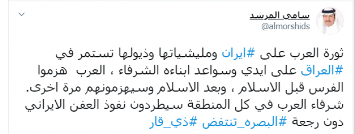 وكتب عبر تغريدة له على "تويتر" رصدها " المشهد العربي": "ثورة العرب على إيران ومليشياتها وذيولها تستمر في العراق على أيدي وسواعد أبناءه الشرفاء، العرب هزموا الفرس قبل الإسلام، وبعد الإسلام وسيهزمونهم مرة أخرى، شرفاء العرب في كل المنطقة سيطردون نفوذ العفن الإيراني دون رجعة".