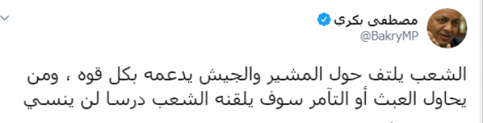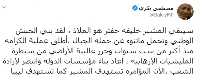 وكتب عبر تغريدة له على "تويتر" رصدها " المشهد العربي": "سيبقى المشير خليفة حفتر هو الملاذ، لقد بنى الجيش الوطني وتحمل ما تنوء عن حمله الجبال ،أطلق عملية الكرامة منذ أكثر من ست سنوات وحرر غالبية الأراضي من سيطرة المليشيات الإرهابية، أعاد بناء مؤسسات الدولة وانتصر لإرادة الشعب ،الآن المؤامرة تستهدف المشير كما تستهدف ليبيا، الشعب يلتف حول المشير والجيش يدعمه بكل قوة، ومن يحاول العبث أو التآمر سوف يلقنه الشعب درسا لن ينسى".