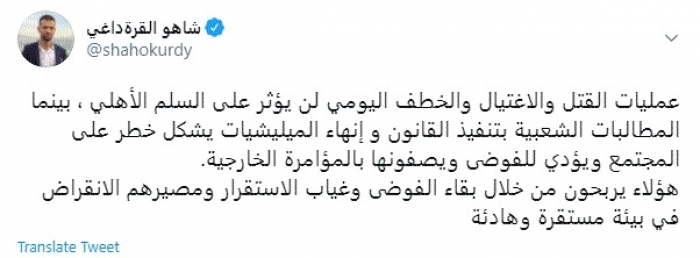 وقال في تغريدة عبر "تويتر" رصدها "المشهد العربي": "عمليات القتل والاغتيال والخطف اليومي لن يؤثر على السلم الأهلي، بينما المطالبات الشعبية بتنفيذ القانون وإنهاء الميليشيات يشكل خطر على المجتمع ويؤدي للفوضى ويصفونها بالمؤامرة الخارجية".