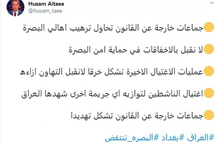 وكتب في تغريدة عبر "تويتر" رصدها "المشهد العربي": "جماعات خارجة عن القانون تحاول ترهيب أهالي البصرة.. لا نقبل بالإخفاقات في حماية أمن البصرة".
