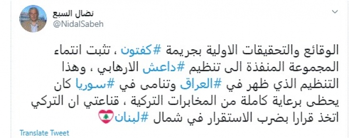 وقال في تغريدة عبر "تويتر" رصدها "المشهد العربي": "الوقائع والتحقيقات الأولية بجريمة كفتون ، تثبت انتماء المجموعة المنفذة إلى تنظيم داعش الارهابي ، وهذا التنظيم الذي ظهر في العراق وتنامى في سوريا كان يحظى برعاية كاملة من المخابرات التركية ، قناعتي أن التركي اتخذ قرارا بضرب الاستقرار في شمال لبنان".