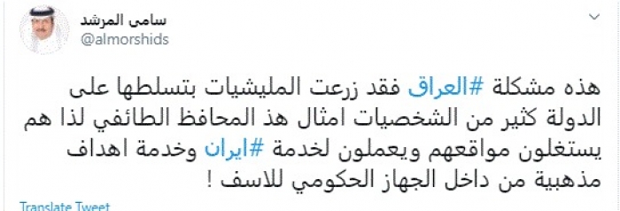 وقال في تغريدة عبر "تويتر" رصدها "المشهد العربي": "هذه مشكلة العراق فقد زرعت المليشيات بتسلطها على الدولة كثير من الشخصيات أمثال هذ المحافظ الطائفي لذا هم يستغلون مواقعهم ويعملون لخدمة إيران وخدمة أهداف مذهبية من داخل الجهاز الحكومي للأسف".