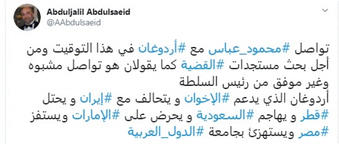 وجه الإعلامي السعودي عبدالجليل السعيد، اليوم، انتقادًا لاذعًا للرئيس الفلسطيني محمود عباس أبو مازن، بعد الاتصال الذي تلقاه من نظيره التركي رجب طيب أردوغان.