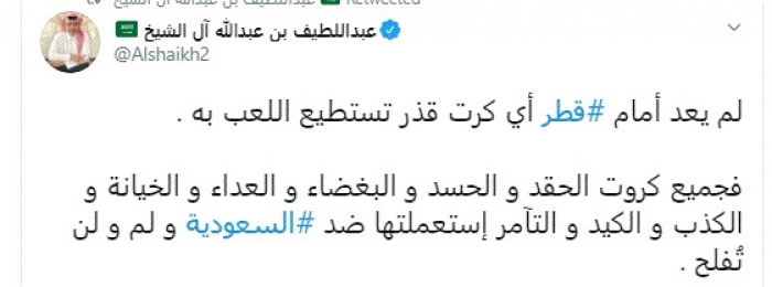 وكتب في تغريدة عبر "تويتر" رصدها "المشهد العربي": "لم يعد أمام قطر أي كارت قذر تستطيع اللعب به. فجميع كروت الحقد و الحسد والبغضاء والعداء والخيانة والكذب والكيد والتآمر استعملتها ضد السعودية ولم ولن تُفلح".