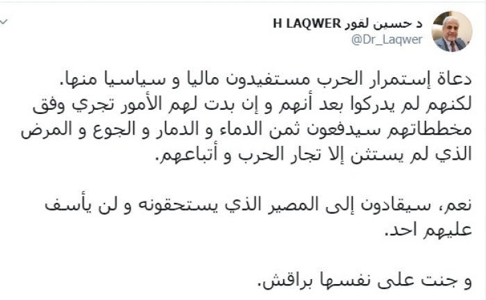 وكتب عبر تغريدة له على "تويتر" رصدها "المشهد العربي": "دعاة استمرار الحرب مستفيدون ماليا و سياسيا منها، لكنهم لم يدركوا بعد أنهم وإن بدت لهم الأمور تجري وفق مخططاتهم سيدفعون ثمن الدماء والدمار والجوع والمرض الذي لم يستثن إلا تجار الحرب وأتباعهم، نعم، سيقادون إلى المصير الذي يستحقونه ولن يأسف عليهم أحد، وجنت على نفسها براقش".