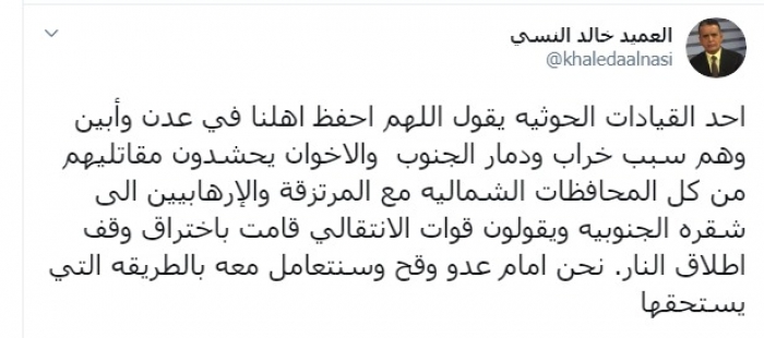 وكتب عبر تغريدة على "تويتر" رصدها "المشهد العربي": "أحد القيادات الحوثية يقول اللهم احفظ أهلنا في عدن وأبين وهم سبب خراب ودمار الجنوب، والإخوان يحشدون مقاتليهم من كل المحافظات الشمالية مع المرتزقة والإرهابيين إلى شقرة الجنوبية ويقولون قوات الانتقالي قامت باختراق وقف إطلاق النار، نحن أمام عدو وقح وسنتعامل معه بالطريقة التي يستحقها".