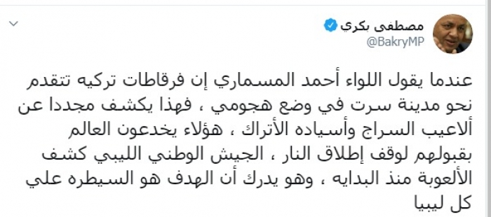 وكتب عبر تغريدة له على "تويتر" رصدها " المشهد العربي": "عندما يقول اللواء أحمد المسماري إن فرقاطات تركية تتقدم نحو مدينة سرت في وضع هجومي ، فهذا يكشف مجددا عن ألاعيب السراج وأسياده الأتراك، هؤلاء يخدعون العالم بقبولهم لوقف إطلاق النار، الجيش الوطني الليبي كشف الألعوبة منذ البداية، وهو يدرك أن الهدف هو السيطرة على كل ليبيا".