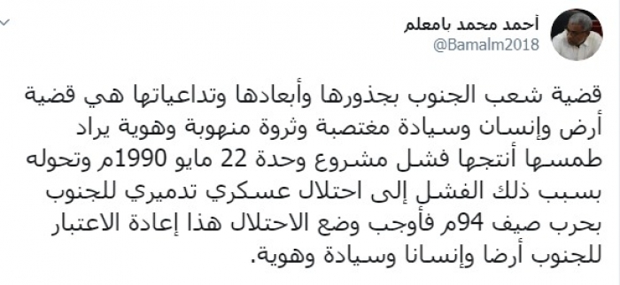 وكتب عبر تغريدة له على "تويتر" رصدها "المشهد العربي": "قضية شعب الجنوب بجذورها وأبعادها وتداعياتها هي قضية أرض وإنسان وسيادة مغتصبة وثروة منهوبة وهوية يراد طمسها أنتجها فشل مشروع وحدة 22 مايو 1990م وتحوله بسبب ذلك الفشل إلى احتلال عسكري تدميري للجنوب بحرب صيف 94م فأوجب وضع الاحتلال هذا إعادة الاعتبار للجنوب أرضا وإنسانا وسيادة وهوية".