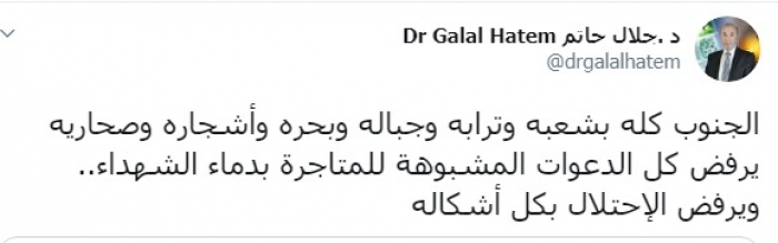وكتب عبر تغريدة له على "تويتر" رصدها "المشهد العربي": "الجنوب كله بشعبه وترابه وجباله وبحره وأشجاره وصحاريه يرفض كل الدعوات المشبوهة للمتاجرة بدماء الشهداء، ويرفض الاحتلال بكل أشكاله".