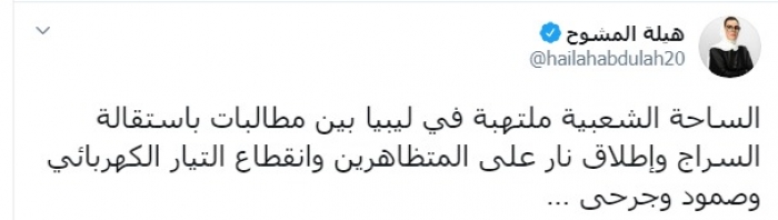 وكتبت عبر تغريدة لها على "تويتر" رصدها " المشهد العربي": "الساحة الشعبية ملتهبة في ليبيا بين مطالبات باستقالة السراج وإطلاق نار على المتظاهرين وانقطاع التيار الكهربائي وصمود وجرحى".