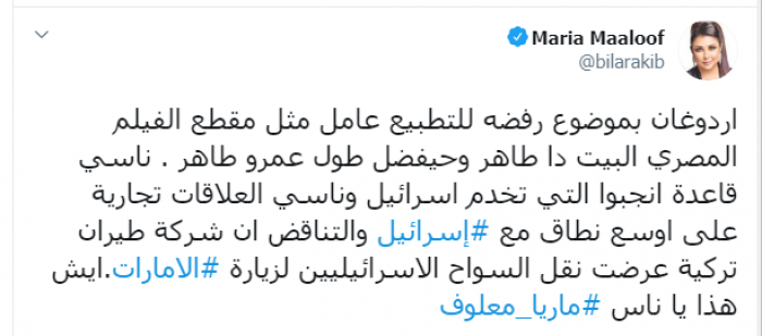 وكتبت عبر تغريدة لها على "تويتر" رصدها " المشهد العربي":"أردوغان بموضوع رفضه للتطبيع عامل مثل مقطع الفيلم المصري البيت دا طاهر وحيفضل طول عمره طاهر، ناسي قاعدة انجبوا التي تخدم إسرائيل وناسي العلاقات التجارية على أوسع نطاق مع إسرائيل، والتناقض أن شركة طيران تركية عرضت نقل السواح الإسرائيليين لزيارة الإمارات، ايش هذا يا ناس".