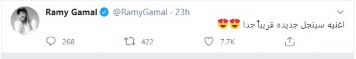 أعلن المطرب رامي جمال، عبر حسابه الرسمي بموقع تويتر، عن طرحه أغنية "سينجل" جديدة خلال الفترة المقبلة.