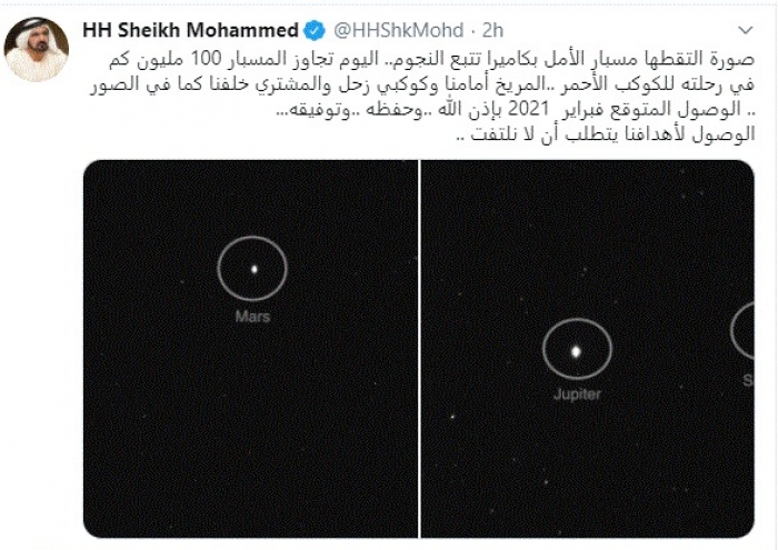 وقال في تغريدة عبر "تويتر" رصدها "المشهد العربي": "صورة التقطها مسبار الأمل بكاميرا تتبع النجوم.. اليوم تجاوز المسبار 100 مليون كم في رحلته للكوكب الأحمر".