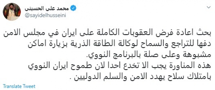 وقال في تغريدة عبر "تويتر" رصدها "المشهد العربي": "بحث إعادة فرض العقوبات الكاملة على إيران في مجلس الأمن دفها للتراجع والسماح لوكالة الطاقة الذرية بزيارة أماكن مشبوهة وعلى صلة بالبرنامج النووي".