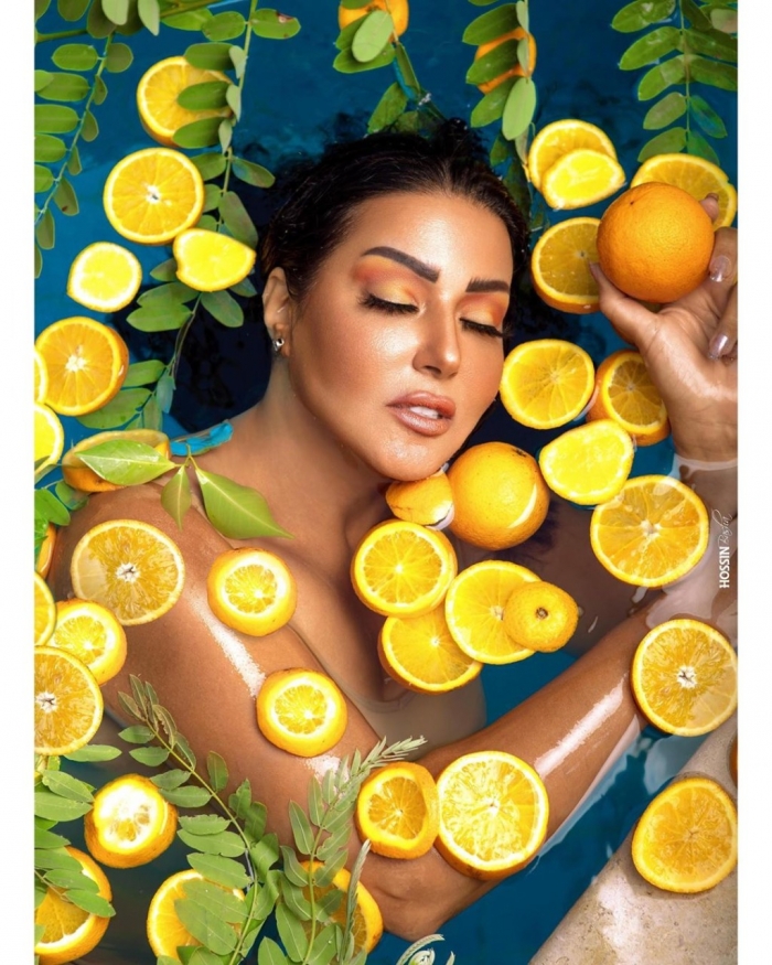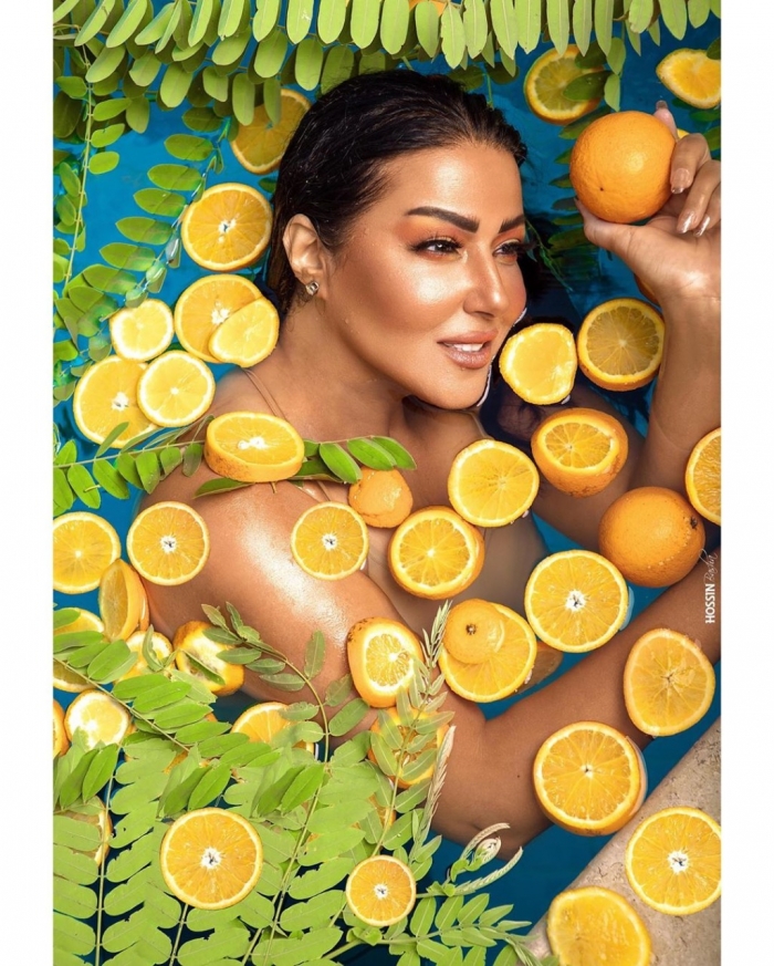 وظهرت "الخشاب" في الصور وسط فاكهة "البرتقال" داخل حمام سباحة.