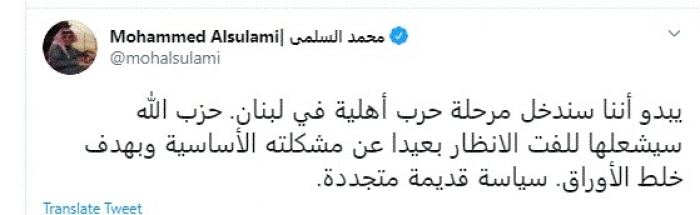 وقال في تغريدة عبر "تويتر" رصدها "المشهد العربي": "يبدو أننا سندخل مرحلة حرب أهلية في لبنان. حزب الله سيشعلها للفت الانظار بعيدا عن مشكلته الأساسية وبهدف خلط الأوراق. سياسة قديمة متجددة".