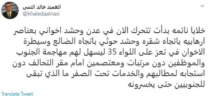 وقال في تغريدة عبر "تويتر" رصدها "المشهد العربي": "خلايا نائمة بدأت تتحرك الآن في عدن وحشد إخواني بعناصر إرهابية باتجاه شقرة وحشد حوثي باتجاه الضالع وسيطرة الإخوان في تعز على اللواء 35 ليسهل لهم مهاجمة الجنوب".