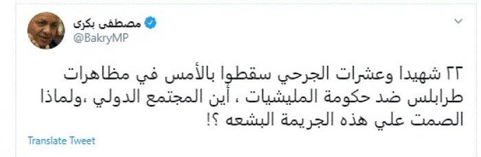بكري يُعلق على سقوط شهداء وجرحى في تظاهرات طرابلس