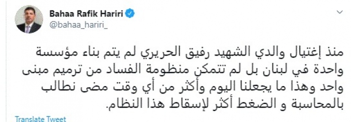 هاجم بهاء الدين الحريري نجل رئيس حكومة لبنان الراحل رفيق الحريري، اليوم، السلطة اللبنانية، مُطالبًا في الوقت ذاته بإسقاط النظام اللبناني.
