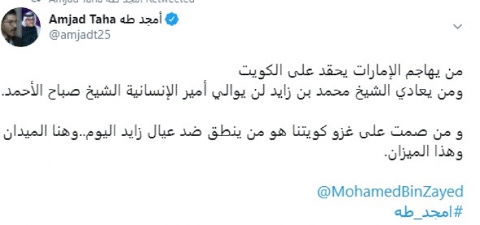 وقال في تغريدة عبر "تويتر" رصدها "المشهد العربي": "من يهاجم الإمارات يحقد على الكويت ومن يعادي الشيخ محمد بن زايد لن يوالي أمير الإنسانية الشيخ صباح الأحمد.