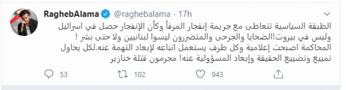 وكتب علامة تغريدة، عبر حسابه الرسمي بموقع "تويتر": "الطبقة السياسية تتعاطى مع جريمة إنفجار المرفأ وكأن الإنفجار حصل في إسرائيل وليس في بيروت! الضحايا والجرحى والمتضررون ليسوا لبنانيين ولا حتى بشر ! المحاكمة اصبحت إعلامية وكل طرف يستعمل اتباعه لإبعاد التهمة عنه. الكل يحاول تمييع وتضييع الحقيقة وإبعاد المسؤولية عنه! مجرمون قتلة خنازير".