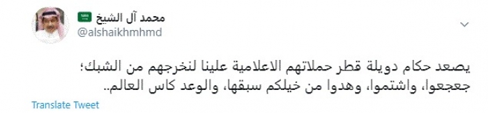 وقال في تغريدة عبر "تويتر" رصدها "المشهد العربي": "يصعد حكام دويلة قطر حملاتهم الاعلامية علينا لنخرجهم من الشبك؛ جعجعوا، واشتموا، وهدوا من خيلكم سبقها، والوعد كأس العالم".