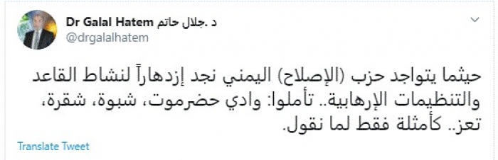 كشف الأكاديمي الجنوبي رئيس جامعة "أم القيوين" الإماراتية الدكتور جلال حاتم، اليوم، علاقة حزب الإصلاح بنشاط التنظيمات الإرهابية في اليمن.
