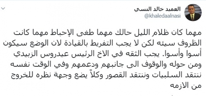 وكتب عبر تغريدة له على "تويتر" رصدها "المشهد العربي": "مهما كان ظلام الليل حالكا مهما طغى الإحباط مهما كانت الظروف سيئة لكن لا يجب التفريط بالقيادة لأن الوضع سيكون أسوأ وأسوأ، يجب الثقة في الأخ الرئيس عيدروس الزُبيدي ومن حوله والوقوف إلى جانبهم ودعمهم وفي الوقت نفسه ننتقد السلبيات وننتقد القصور وكل يضع وجهة نظره للخروج من الأزمة".