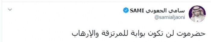 أكد الإعلامي السعودي سامي الجعوني، اليوم الإثنين، أن حضرموت لن تكون بوابة للمرتزقة والإرهاب أبدا.
