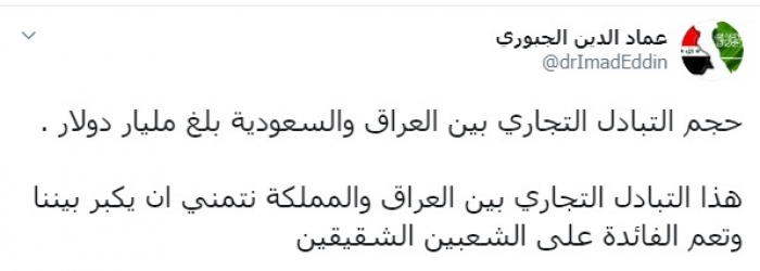 وكتب عبر تغريدة له على "تويتر" رصدها " المشهد العربي": "حجم التبادل التجاري بين العراق والسعودية بلغ مليار دولار، هذا التبادل التجاري بين العراق والمملكة نتمنى أن يكبر بيننا وتعم الفائدة على الشعبين الشقيقين".