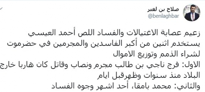 وكتب عبر تغريدة له على "تويتر" رصدها "المشهد العربي": "زعيم عصابة الاغتيالات والفساد اللص أحمد العيسي، يستخدم اثنين من أكبر الفاسدين والمجرمين في حضرموت لشراء الذمم وتوزيع الأموال، الأول، فرج ناجي بن طالب مجرم ونصاب وقاتل كان هاربا خارج البلاد منذ سنوات وظهر قبل أيام، والثاني، محمد بامقا، أحد أشهر وجوه الفساد".