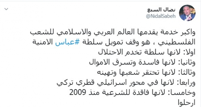 وكتب عبر تغريدة له على "تويتر" رصدها " المشهد العربي": "خدمة يقدمها العالم العربي والإسلامي للشعب الفلسطيني، هو وقف تمويل سلطة عباس الأمنية، أولا، لأنها سلطة تخدم الاحتلال، وثانيا، لأنها فاسدة وتسرق الأموال، وثالثا، لأنها تحتقر شعبها وتهينه،ورابعا، لأنها في محور إسرائيلي قطري تركي، وخامسا، لأنها فاقدة للشرعية منذ 2009، ارحلوا".