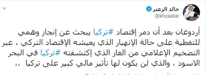 وكتب عبر تغريدة له على "تويتر" رصدها " المشهد العربي": "أردوغان بعد أن دمر اقتصاد تركيا يبحث عن إنجاز وهمي للتغطية على حالة الانهيار الذي يعيشه الاقتصاد التركي، عبر التضخيم الإعلامي من الغاز الذي اكتشفته تركيا في البحر الاسود، والذي لن يكون لها تأثير مالي كبير على تركيا".