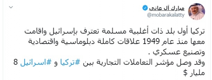 وكتب عبر تغريدة له على "تويتر" رصدها " المشهد العربي": "تركيا أول بلد ذات أغلبية مسلمة تعترف بإسرائيل وأقامت معها منذ عام 1949 علاقات كاملة دبلوماسية واقتصادية وتصنيع عسكري، وقد وصل مؤشر التعاملات التجارية بين تركيا و إسرائيل 8 مليار $".