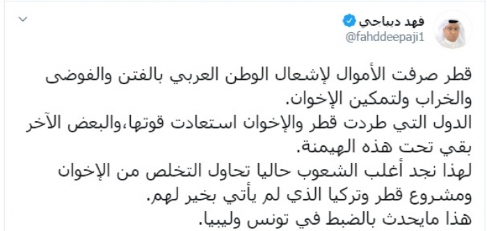 وكتب عبر تغريدة له على "تويتر" رصدها " المشهد العربي":"قطر صرفت الأموال لإشعال الوطن العربي بالفتن والفوضى والخراب ولتمكين الإخوان، الدول التي طردت قطر والإخوان استعادت قوتها، والبعض الآخر بقى تحت هذه الهيمنة، لهذا نجد أغلب الشعوب حاليا تحاول التخلص من الإخوان ومشروع قطر وتركيا الذي لم يأتي بخير لهم، هذا ما يحدث بالضبط في تونس وليبيا".