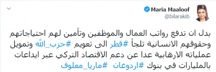 وكتبت عبر تغريدة لها على "تويتر" رصدها " المشهد العربي": "بدل أن تدفع رواتب العمال والموظفين وتؤمن لهم احتياجاتهم وحقوقهم الإنسانية تلجأ قطر إلى تعويم حزب الله وتمويل عملياته الإرهابية عدا عن دعم الاقتصاد التركي عبر إيداعات بالمليارات في بنوك أردوغان".