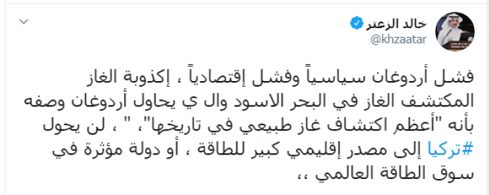 وكتب عبر تغريدة له على "تويتر" رصدها " المشهد العربي": "فشل أردوغان سياسياً وفشل اقتصادياً، أكذوبة الغاز المكتشف، الغاز في البحر الأسود والذي يحاول أردوغان وصفه بأنه "أعظم اكتشاف غاز طبيعي في تاريخها"، لن يحول تركيا إلى مصدر إقليمي كبير للطاقة، أو دولة مؤثرة في سوق الطاقة العالمي".