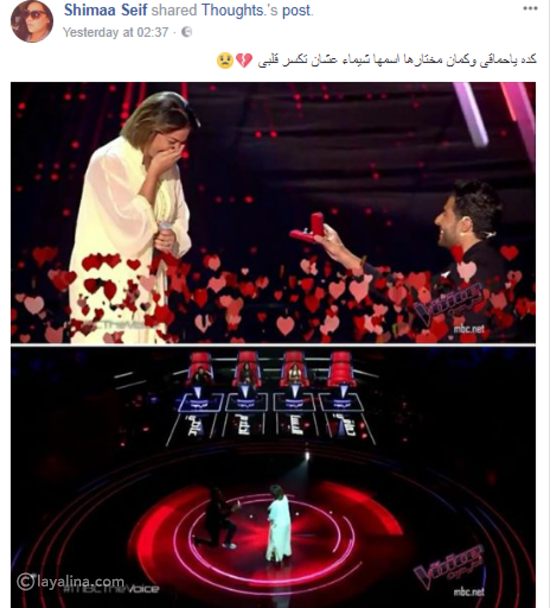 ونشرت شيماء سيف صوراً لمحمد حماقي وهو يقدم خاتماً لمتسابقة "ذا فويس"، وعلقت قائلة: " كده ياحماقى وكمان مختارها اسمها شيماء عشان تكسر قلبي".