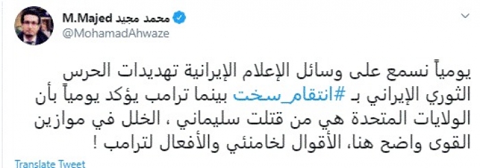 وقال في تغريدة عبر "تويتر" رصدها "المشهد العربي": "يومياً نسمع على وسائل الإعلام الإيرانية تهديدات الحرس الثوري الإيراني بـانتقام سخت بينما ترامب يؤكد يومياً بأن الولايات المتحدة هي من قتلت سليماني ، الخلل في موازين القوى واضح هنا، الأقوال لخامنئي والأفعال لترامب".