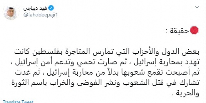 وقال في تغريدة عبر "تويتر" رصدها "المشهد العربي": بعض الدول والأحزاب التي تمارس المتاجرة بفلسطين كانت تهدد بمحاربة إسرائيل ، ثم صارت تحمي وتدعم أمن إسرائيل ، ثم أصبحت تقمع شعوبها بدلاً من محاربة إسرائيل ، ثم غدت تشارك في قتل الشعوب ونشر الفوضى والخراب باسم الثورة والحرية".