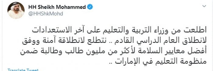 وقال في تغريدة عبر "تويتر" رصدها "المشهد العربي": " اطلعت من وزراء التربية والتعليم على آخر الاستعدادات لانطلاق العام الدراسي القادم .. نتطلع لانطلاقة آمنة ووفق أفضل معايير السلامة لأكثر من مليون طالب وطالبة ضمن منظومة التعليم في الإمارات".