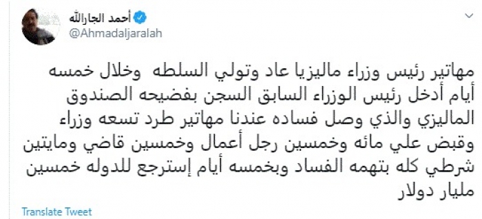 وقال في تغريدة عبر "تويتر" رصدها "المشهد العربي": "مهاتير رئيس وزراء ماليزيا عاد وتولى السلطة وخلال خمسة أيام أدخل رئيس الوزراء السابق السجن بفضيحه الصندوق الماليزي والذي وصل فساده عندنا".
