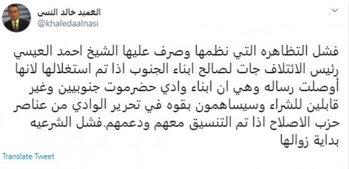 وقال في تغريدة عبر "تويتر" رصدها "المشهد العربي": "فشل التظاهرة التي نظمها وصرف عليها الشيخ أحمد العيسي رئيس الائتلاف جاءت لصالح أبناء الجنوب إذا تم استغلالها لأنها أوصلت رسالة".