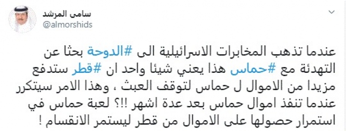 وقال في تغريدة عبر "تويتر" رصدها "المشهد العربي": "عندما تذهب المخابرات الإسرائيلية إلى الدوحة بحثا عن التهدئة مع حماس هذا يعني شيئا واحدًا أن قطر ستدفع مزيدا من الأموال لحماس لتوقف العبث".