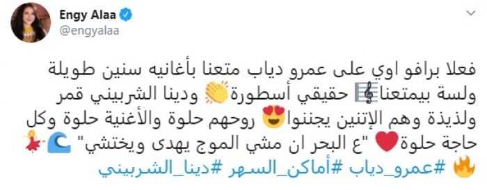 كتبت إنجي علاء تغريدة، عبر حسابها الرسمي بموقع "تويتر": "فعلا برافو اوي على عمرو دياب متعنا بأغانيه سنين طويلة ولسة بيمتعنا، حقيقي أسطورة، ودينا الشربيني قمر ولذيذة وهم الاتنين يجننوا، روحهم حلوة والأغنية حلوة وكل حاجة حلوة، ع البحر إن مشي الموج يهدي ويختشي".