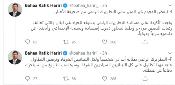 أعلن بهاء الدين الحريري نجل رئيس حكومة لبنان الراحل رفيق الحريري، اليوم، رفضه للهجوم غير المبرر على البطريرك الماروني مار بشارة بطرس الراعي من صحيفة الأخبار.
